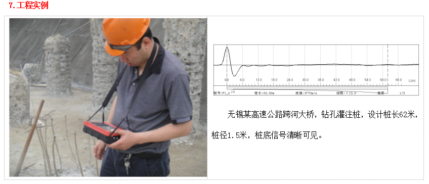利用反射波法檢測(cè)基樁完整性,判定樁身缺陷的程度及位置??捎糜跍y(cè)試灌注樁和打入樁,也可以用于頂面暴露的結(jié)構(gòu)體(如橋墩等)的測(cè)試。