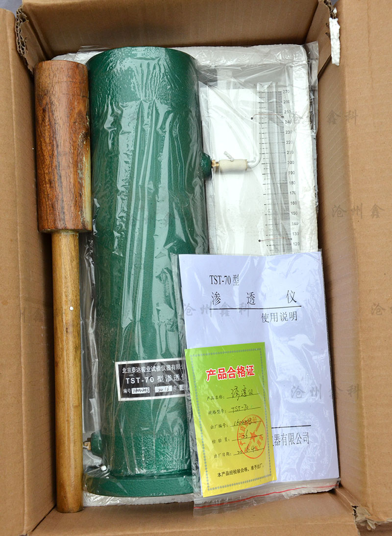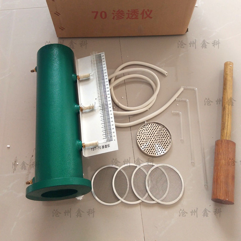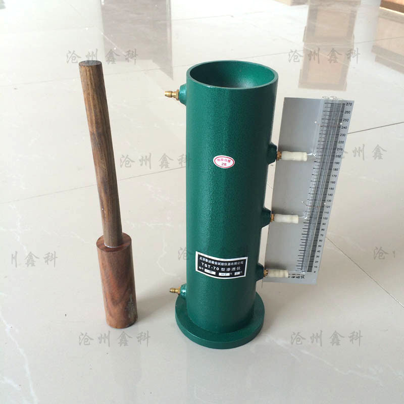 滲水部件由筒身、滲水板、刻度板、測壓管等組成,在刻度板上裝有三個測壓管,其間距為100±0.44mm,水位的測讀可由安裝在筒上的刻度板的刻度讀出,測壓管接頭內(nèi)均裝有銅絲布以防止細(xì)砂粒在試驗(yàn)時隨水流出。滲水筒下部有一排水孔,松開螺栓即可放出污水。擊實(shí)部分備有木錘,以擊實(shí)試樣。本儀器設(shè)計(jì)制造符合(GB9357-77)標(biāo)準(zhǔn),符合《土工試驗(yàn)規(guī)程》(SL237-1999)《公路土工試驗(yàn)規(guī)程》(T0129-93)中的砂類土及含少量礫石的無凝聚性土在常水頭下進(jìn)行滲透試驗(yàn)。