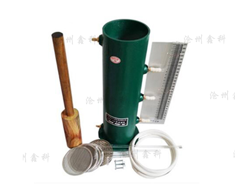 滲水部件由筒身、滲水板、刻度板、測壓管等組成,在刻度板上裝有三個測壓管,其間距為100±0.44mm,水位的測讀可由安裝在筒上的刻度板的刻度讀出,測壓管接頭內(nèi)均裝有銅絲布以防止細砂粒在試驗時隨水流出。滲水筒下部有一排水孔,松開螺栓即可放出污水。擊實部分備有木錘,以擊實試樣。本儀器設(shè)計制造符合(GB9357-77)標準,符合《土工試驗規(guī)程》(SL237-1999)《公路土工試驗規(guī)程》(T0129-93)中的砂類土及含少量礫石的無凝聚性土在常水頭下進行滲透試驗。